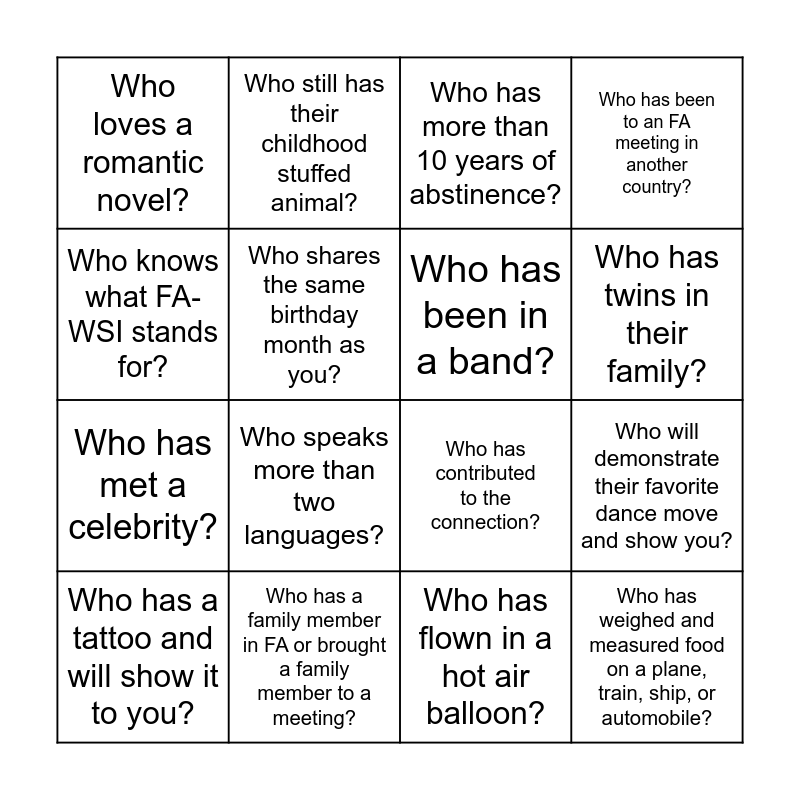 This bingo card has 16 words: Who has a family member in FA or brought a family member to a meeting?, Who will demonstrate their favorite dance move and show you?, Who has more than 10 years of abstinence?, Who loves a romantic novel?, Who has met a celebrity?, Who still has their childhood stuffed animal?, Who has contributed to the connection?, Who has flown in a hot air balloon?, Who knows what FA-WSI stands for?, Who shares the same birthday month as you?, Who has a tattoo and will show it to you?, Who has been to an FA meeting in another country?, Who speaks more than two languages?, Who has twins in their family?, Who has been in a band? and Who has weighed and measured food on a plane, train, ship, or automobile?.