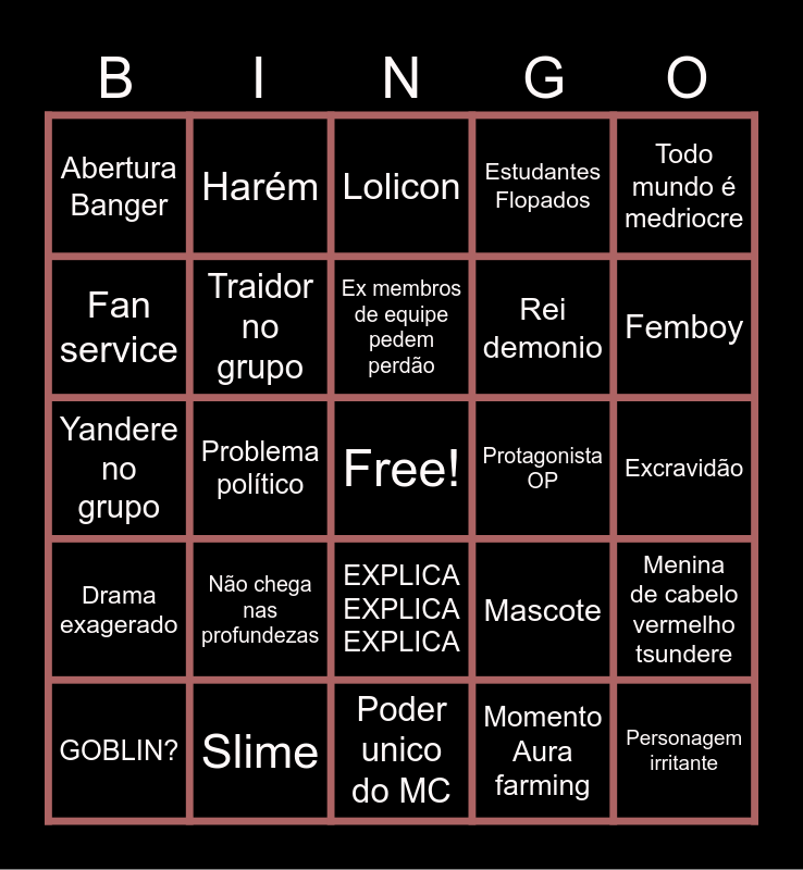 This bingo card has a free space and 24 words: Não chega nas profundezas, Slime, Ex membros de equipe pedem perdão, GOBLIN?, Todo mundo é medriocre, Abertura Banger, Fan service, Harém, Protagonista OP, EXPLICA EXPLICA EXPLICA, Rei demonio, Yandere no grupo, Mascote, Menina de cabelo vermelho tsundere, Traidor no grupo, Momento Aura farming, Excravidão, Lolicon, Femboy, Problema político, Personagem irritante, Drama exagerado, Estudantes Flopados and Poder unico do MC.