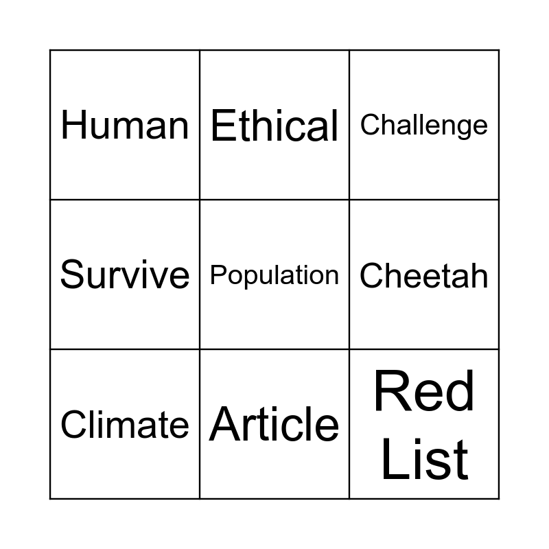 This bingo card has a free space and 17 words: Danger, Extinction, Challenge, Human, Endangered, Survive, Trouble, Climate, Article, Cheetah, Sea Otter, Conditions, Red List, Ethical, Responsible, Labour and Vegan.