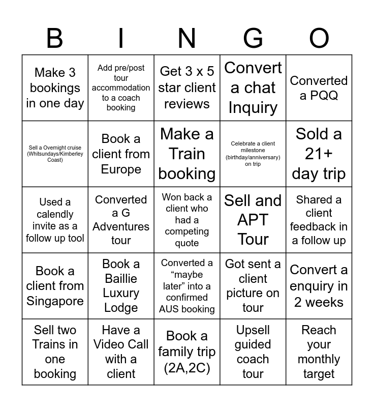 This bingo card has a free space and 42 words: Convert campervan enquiry, Make a Train booking, Book a longer tour then enquired about, Book a Baillie Luxury Lodge, Upsell guided coach tour, Convert a enquiry in 2 weeks, Reach your monthly target, Reach your monthly target 2 months in a row, Get 3 x 5 star client reviews, Converted a “maybe later” into a confirmed AUS booking, Shared a client feedback in a follow up, Sold a 21+ day trip, Converted a G Adventures tour, Converted a PQQ, Referred a client to NZ office, Got sent a client picture on tour, Reached a 25% conversion for a month, Used a calendly invite as a follow up tool, Book a Europcar Vehicle, Add pre/post tour accommodation to a coach booking, Sell a Overnight cruise (Whitsundays/Kimberley Coast), Increase your average booking value from the month of May, Record your highest single Aus trip sale ever, Make 3 bookings in one day, Add on accom or acitivies to and already booked Client, Have an average margin of 30% for the month, Celebrate a client milestone (birthday/anniversary) on trip, Book someone with the same first name as you, Take a deposit over the phone, Book a client from India, Book a client from Ireland, Book a client from Singapore, Book a client from Europe, Book a family trip (2A,2C), Book AAT Kings to travel this year, Sell two Trains in one booking, Have a Video Call with a client, Sell and APT Tour, Convert and Ozsidekick, Get 3 x Phone Inquiries in a week, Convert a chat Inquiry and Sell a JB Holiday Package.