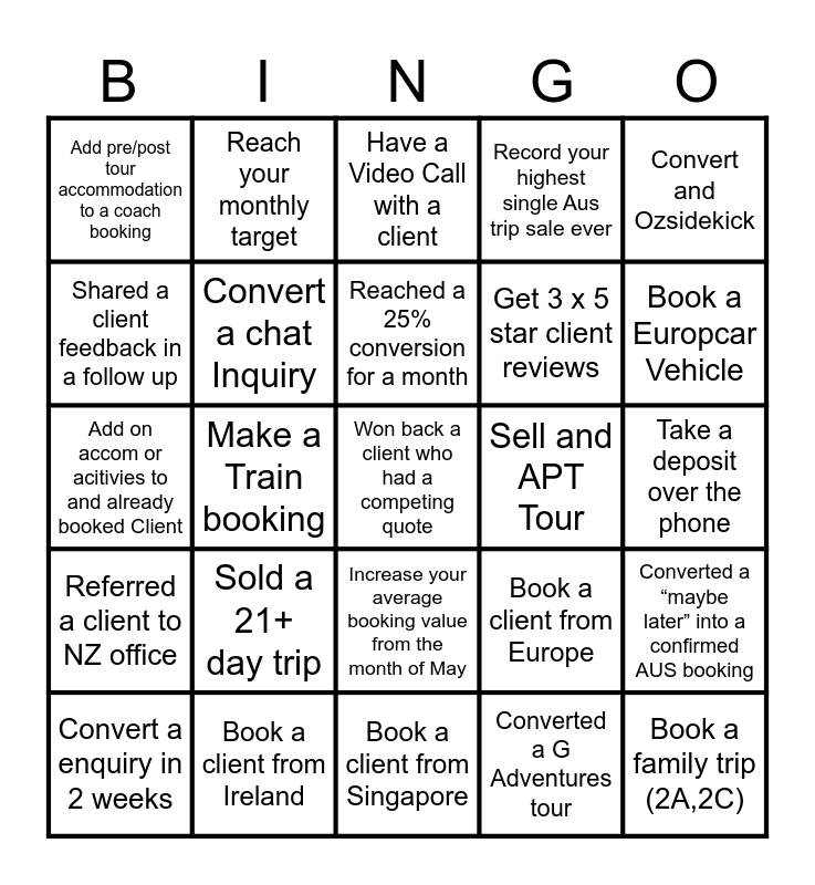 This bingo card has 43 words: Convert a Camper-van Enquiry, Make a Train booking, Book a longer tour then enquired about, Book a Baillie Luxury Lodge, Upsell guided coach tour, Convert a enquiry in 2 weeks, Reach your monthly target, Reach your monthly target 2 months in a row, Get 3 x 5 star client reviews, Converted a “maybe later” into a confirmed AUS booking, Shared a client feedback in a follow up, Sold a 21+ day trip, Won back a client who had a competing quote, Converted a G Adventures tour, Converted a PQQ, Referred a client to NZ office, Got sent a client picture on tour, Reached a 25% conversion for a month, Used a calendly invite as a follow up tool, Book a Europcar Vehicle, Add pre/post tour accommodation to a coach booking, Sell a Overnight cruise (Whitsundays/Kimberley Coast), Increase your average booking value from the month of May, Record your highest single Aus trip sale ever, Make 3 bookings in one day, Add on accom or acitivies to and already booked Client, Have an average margin of 30% for the month, Celebrate a client milestone (birthday/anniversary) on trip, Book someone with the same first name as you, Take a deposit over the phone, Book a client from India, Book a client from Ireland, Book a client from Singapore, Book a client from Europe, Book a family trip (2A,2C), Book AAT Kings to travel this year, Sell two Trains in one booking, Have a Video Call with a client, Sell and APT Tour, Convert and Ozsidekick, Get 3 x Phone Inquiries in a week, Convert a chat Inquiry and Sell a JB Holiday Package.