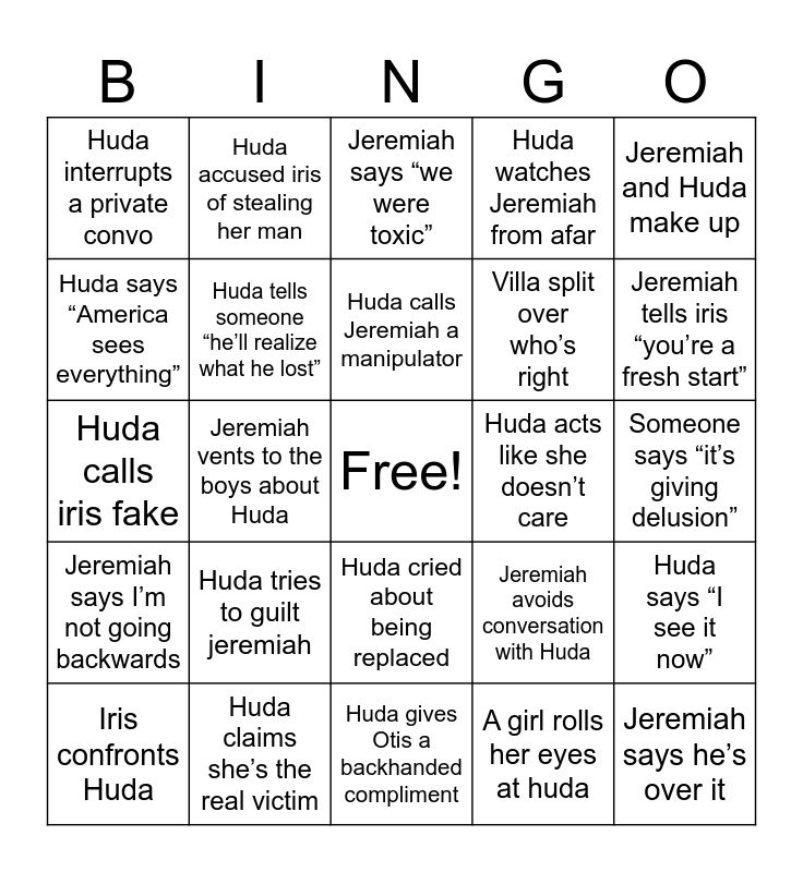 This bingo card has a free space and 24 words: Huda tries to guilt jeremiah, Huda claims she’s the real victim, Huda calls Jeremiah a manipulator, Iris confronts Huda, Jeremiah and Huda make up, Huda interrupts a private convo, Huda says “America sees everything”, Huda accused iris of stealing her man, Huda acts like she doesn’t care, Huda cried about being replaced, Villa split over who’s right, Huda calls iris fake, Jeremiah avoids conversation with Huda, Huda says “I see it now”, Huda tells someone “he’ll realize what he lost”, A girl rolls her eyes at huda, Someone says “it’s giving delusion”, Jeremiah says “we were toxic”, Jeremiah tells iris “you’re a fresh start”, Jeremiah vents to the boys about Huda, Jeremiah says he’s over it, Jeremiah says I’m not going backwards, Huda watches Jeremiah from afar and Huda gives Otis a backhanded compliment.