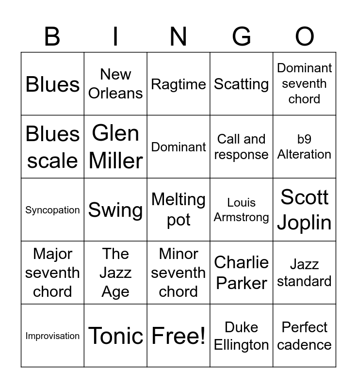 This bingo card has 31 words: Free!, Bebop, Swing, Dixieland, Blues, Ragtime, Glen Miller, Charlie Parker, Louis Armstrong, Duke Ellington, Scott Joplin, Melting pot, Perfect cadence, Diatonic, b9 Alteration, 2 5 1 Progression, Jazz standard, The Jazz Age, Major seventh chord, Minor seventh chord, Dominant seventh chord, Lead sheet, Improvisation, New Orleans, Call and response, Blues scale, Scatting, Syncopation, Tonic, Dominant and Supertonic.