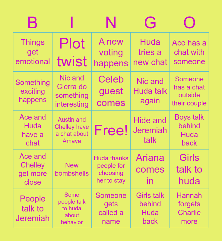 This bingo card has a free space and 24 words: New bombshells, Some people talk to huda about behavior, Celeb guest comes, People talk to Jeremiah, Ace has a chat with someone, Things get emotional, Something exciting happens, Plot twist, Hide and Jeremiah talk, Huda thanks people for choosing her to stay, Nic and Huda talk again, Ace and Huda have a chat, Ariana comes in, Girls talk to huda, Nic and Cierra do something interesting, Girls talk behind Huda back, Boys talk behind Huda back, A new voting happens, Someone has a chat outside their couple, Austin and Chelley have a chat about Amaya, Hannah forgets Charlie more, Ace and Chelley get more close, Huda tries a new chat and Someone gets called a name.