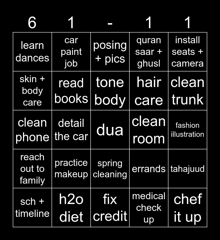This bingo card has 25 words: practice makeup, fix credit, tone body, sch + timeline, install seats + camera, learn dances, skin + body care, car paint job, clean room, spring cleaning, hair care, clean phone, errands, tahajuud, read books, chef it up, fashion illustration, posing + pics, clean trunk, detail the car, dua, h2o diet, reach out to family, quran saar + ghusl and medical check up.