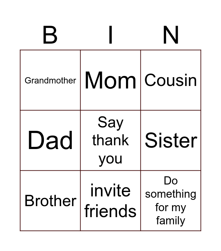 This bingo card has a free space and 8 words: Dad, Mom, Sister, Brother, Cousin, Grandmother, invite friends and Do something for my family.