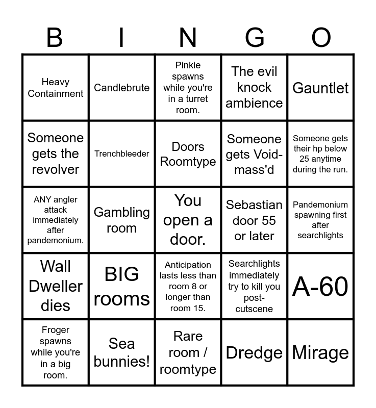 This bingo card has a free space and 24 words: Froger spawns while you're in a big room., BIG rooms, Doors Roomtype, Dredge, Gauntlet, Heavy Containment, Candlebrute, Pinkie spawns while you're in a turret room., Sebastian door 55 or later, Pandemonium spawning first after searchlights, ANY angler attack immediately after pandemonium., Trenchbleeder, Searchlights immediately try to kill you post-cutscene, A-60, Someone gets the revolver, Sea bunnies!, Rare room / roomtype, The evil knock ambience, Someone gets their hp below 25 anytime during the run., Wall Dweller dies, Gambling room, Anticipation lasts less than room 8 or longer than room 15., Someone gets Void-mass'd and Mirage.