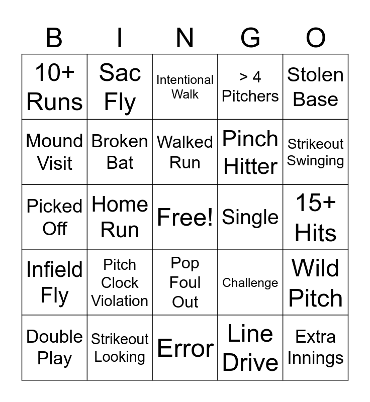 This bingo card has a free space and 33 words: Double, Triple, Home Run, G R Double, Infield Fly, Broken Bat, Stolen Base, Double Play, Sac Fly, Bases Loaded, Walked Run, Intentional Walk, Grand Slam, Hit by Pitch, Single, Strikeout Swinging, Strikeout Looking, Picked Off, Pitch Clock Violation, Challenge, Pop Foul Out, Ejection, 10+ Runs, 15+ Hits, Error, Extra Innings, > 4 Pitchers, Pinch Hitter, Mound Visit, Wild Pitch, Ground Ball, Line Drive and Pop Fly.