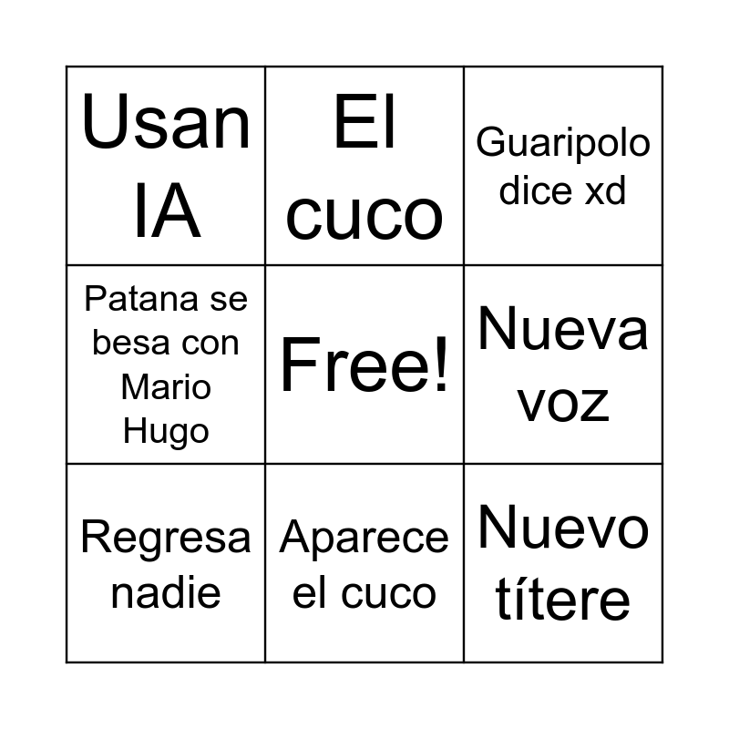 This bingo card has a free space and 11 words: Aparece Cindy, Bodoque apuesta, Nueva voz, Regresa nadie, Guaripolo dice xd, Usan IA, Aparece el cuco, Esta Rodrigo, Patana se besa con Mario Hugo, El cuco and Nuevo títere.