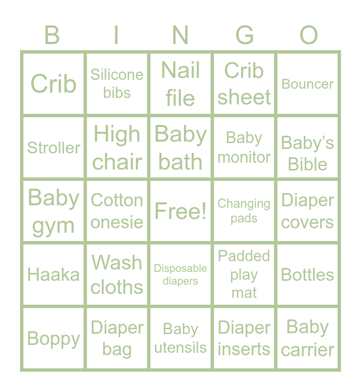 This bingo card has a free space and 24 words: Wash cloths, Diaper bag, Baby bath, Boppy, Bouncer, Crib, Stroller, Silicone bibs, Changing pads, Disposable diapers, Baby monitor, Baby gym, Padded play mat, Bottles, High chair, Diaper inserts, Diaper covers, Nail file, Baby’s Bible, Cotton onesie, Baby carrier, Haaka, Crib sheet and Baby utensils.