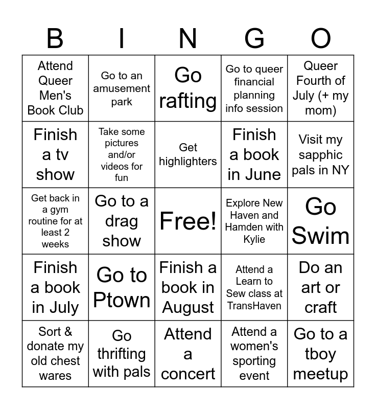 This bingo card has a free space and 24 words: Go to Ptown, Go thrifting with pals, Get highlighters, Sort & donate my old chest wares, Queer Fourth of July (+ my mom), Attend Queer Men's Book Club, Finish a tv show, Go to an amusement park, Explore New Haven and Hamden with Kylie, Finish a book in August, Finish a book in June, Get back in a gym routine for at least 2 weeks, Attend a Learn to Sew class at TransHaven, Do an art or craft, Take some pictures and/or videos for fun, Attend a women's sporting event, Go Swim, Go rafting, Visit my sapphic pals in NY, Go to a drag show, Go to a tboy meetup, Finish a book in July, Go to queer financial planning info session and Attend a concert.