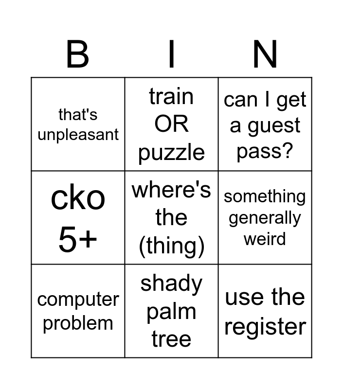 This bingo card has a free space and 8 words: something generally weird, can I get a guest pass?, train OR puzzle, computer problem, that's unpleasant, use the register, cko 5+ and shady palm tree.