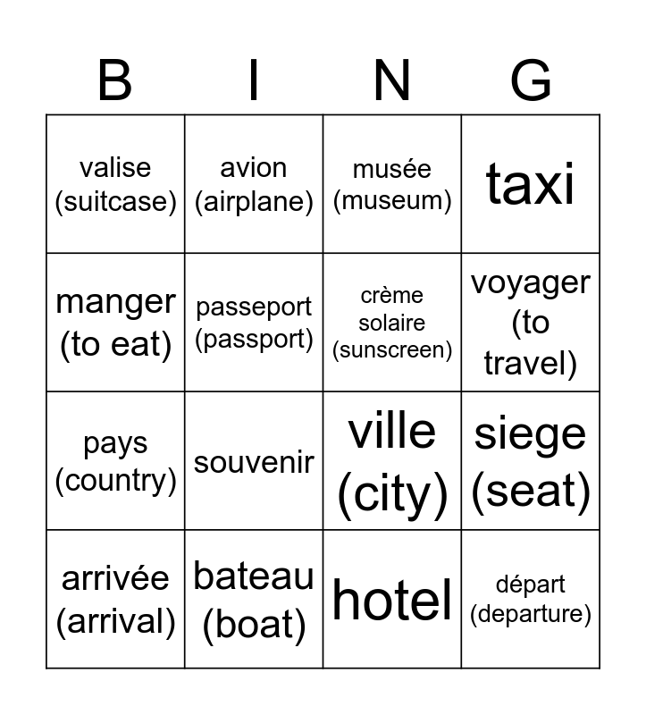 This bingo card has 24 words: Free!, vacances (vacation), voyager (to travel), explorer (to explore), manger (to eat), valise (suitcase), passeport (passport), avion (airplane), bateau (boat), train, pays (country), ville (city), population, température, crème solaire (sunscreen), tourisme (tourism), hotel, musée (museum), souvenir, siege (seat), arrivée (arrival), départ (departure), taxi and monnaie (money).