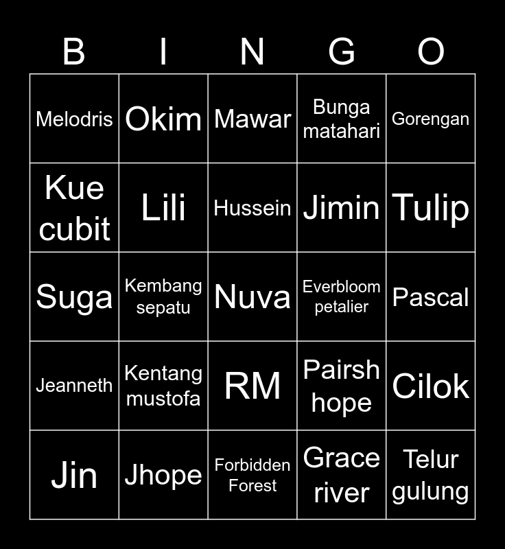 This bingo card has a free space and 24 words: Kentang mustofa, Jhope, Hussein, Jin, Gorengan, Melodris, Kue cubit, Okim, Everbloom petalier, RM, Jimin, Suga, Pairsh hope, Cilok, Lili, Grace river, Pascal, Mawar, Tulip, Kembang sepatu, Telur gulung, Jeanneth, Bunga matahari and Forbidden Forest.
