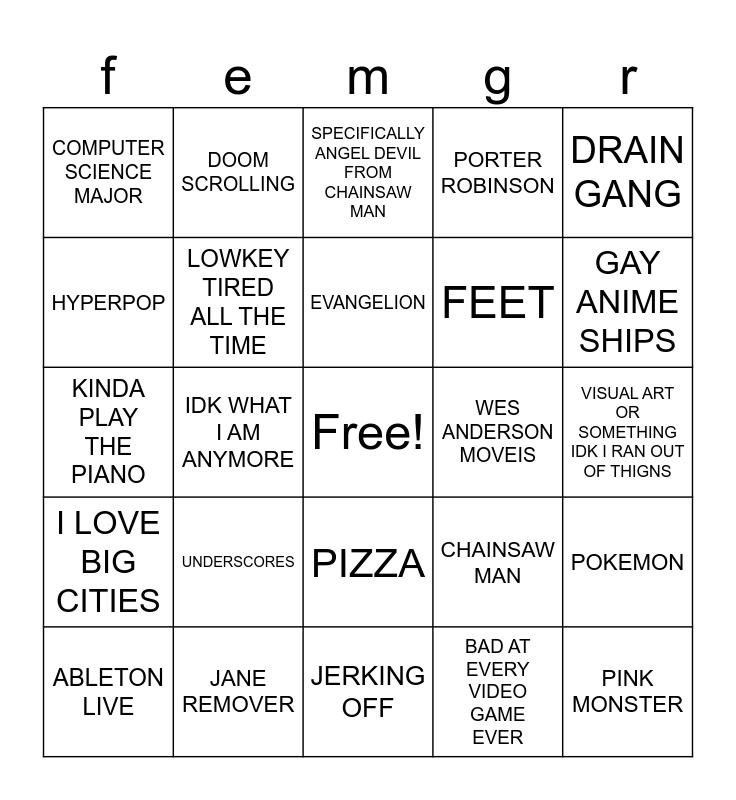 This bingo card has a free space and 24 words: UNDERSCORES, JANE REMOVER, EVANGELION, ABLETON LIVE, DRAIN GANG, COMPUTER SCIENCE MAJOR, HYPERPOP, DOOM SCROLLING, WES ANDERSON MOVEIS, PIZZA, FEET, KINDA PLAY THE PIANO, CHAINSAW MAN, POKEMON, LOWKEY TIRED ALL THE TIME, BAD AT EVERY VIDEO GAME EVER, VISUAL ART OR SOMETHING IDK I RAN OUT OF THIGNS, SPECIFICALLY ANGEL DEVIL FROM CHAINSAW MAN, GAY ANIME SHIPS, IDK WHAT I AM ANYMORE, PINK MONSTER, I LOVE BIG CITIES, PORTER ROBINSON and JERKING OFF.