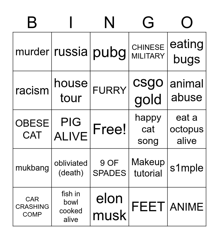 This bingo card has a free space and 24 words: obliviated (death), fish in bowl cooked alive, FURRY, CAR CRASHING COMP, eating bugs, murder, racism, russia, happy cat song, 9 OF SPADES, csgo gold, OBESE CAT, Makeup tutorial, s1mple, house tour, FEET, eat a octopus alive, pubg, animal abuse, PIG ALIVE, ANIME, mukbang, CHINESE MILITARY and elon musk.