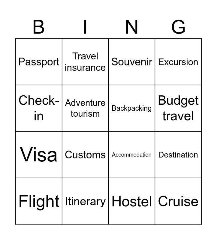 This bingo card has 41 words: Free!, Accommodation, Airport, Backpacking, Boarding pass, Booking/reservation, Budget travel, Car rental, Check-in, Cruise, Destination, Excursion, Flight, Hostel, Itinerary, Luggage / Suitcase, Migration, Passport, Sightseeing, Souvenir, Tour guide, Travel agency, Trip, Visa, Vacation, Wanderlust, Transportation, Ticket, Customs, Hotel, Resort, Travel insurance, Departure, Arrival, Local cuisine, Adventure tourism, Eco-tourism, Cultural heritage, Package tour, Travel documents and Scenic route.