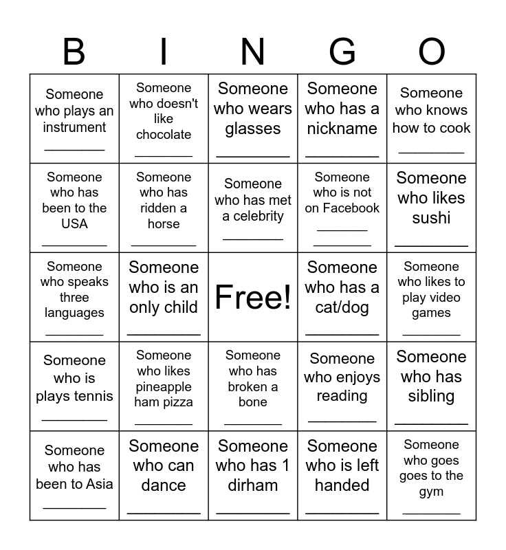 This bingo card has a free space and 24 words: Someone who likes pineapple ham pizza ________, Someone who can dance ________, Someone who has met a celebrity ________, Someone who has been to Asia ________, Someone who knows how to cook ________, Someone who plays an instrument ________, Someone who has been to the USA _________, Someone who doesn't like chocolate ________, Someone who has a cat/dog ________, Someone who has broken a bone ________, Someone who is not on Facebook _______ ________, Someone who speaks three languages ________, Someone who enjoys reading ________, Someone who has sibling ________, Someone who has ridden a horse _________, Someone who is left handed ________, Someone who likes to play video games ________, Someone who wears glasses ________, Someone who likes sushi ________, Someone who is an only child ________, Someone who goes goes to the gym ________, Someone who is plays tennis ________, Someone who has a nickname ________ and Someone who has 1 dirham ________.