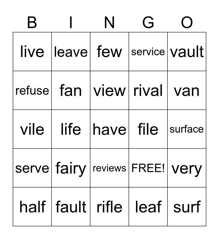 This bingo card has 25 words: fairy, rifle, view, half, vault, live, refuse, leave, file, reviews, rival, vile, FREE!, very, fan, surf, surface, few, van, life, have, fault, serve, service and leaf.