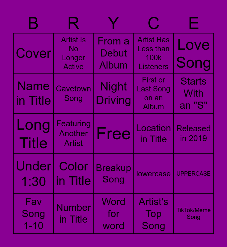 This bingo card has a free space and 24 words: Color in Title, Number in Title, Night Driving, Fav Song 1-10, Love Song, Cover, Name in Title, Artist Is No Longer Active, Location in Title, Breakup Song, First or Last Song on an Album, Long Title, lowercase, UPPERCASE, Cavetown Song, Artist's Top Song, Released in 2019, From a Debut Album, Starts With an "S", Featuring Another Artist, TikTok/Meme Song, Under 1:30, Artist Has Less than 100k Listeners and Word for word.