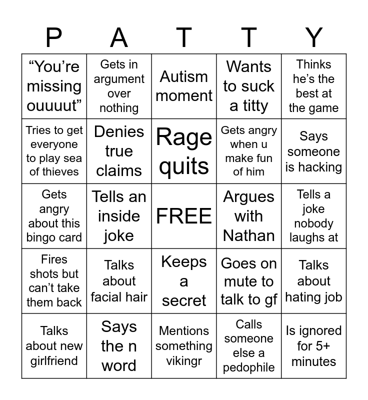 This bingo card has a free space and 24 words: Talks about facial hair, Says the n word, Rage quits, Talks about new girlfriend, Thinks he’s the best at the game, “You’re missing ouuuut”, Tries to get everyone to play sea of thieves, Gets in argument over nothing, Argues with Nathan, Keeps a secret, Gets angry when u make fun of him, Gets angry about this bingo card, Goes on mute to talk to gf, Talks about hating job, Denies true claims, Calls someone else a pedophile, Tells a joke nobody laughs at, Autism moment, Says someone is hacking, Tells an inside joke, Is ignored for 5+ minutes, Fires shots but can’t take them back, Wants to suck a titty and Mentions something vikingr.