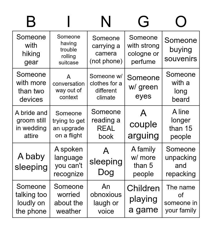 This bingo card has a free space and 24 words: A spoken language you can't recognize, Someone worried about the weather, Someone w/ clothes for a different climate, Someone talking too loudly on the phone, Someone buying souvenirs, Someone with hiking gear, Someone with more than two devices, Someone having trouble rolling suitcase, A couple arguing, A sleeping Dog, Someone w/ green eyes, A bride and groom still in wedding attire, A family w/ more than 5 people, Someone unpacking and repacking, A conversation way out of context, Children playing a game, A line longer than 15 people, Someone carrying a camera (not phone), Someone with a long beard, Someone trying to get an upgrade on a flight, The name of someone in your family, A baby sleeping, Someone with strong cologne or perfume and An obnoxious laugh or voice.