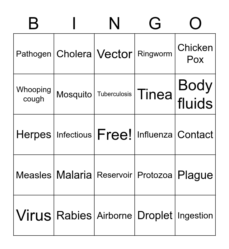This bingo card has a free space and 29 words: Virus, Bacteria, Infectious, Contagious, Pathogen, Vector, Mosquito, Malaria, Influenza, Rabies, Contact, Ingestion, Airborne, Droplet, Body fluids, Fomite, Reservoir, Measles, Chicken Pox, Herpes, Protozoa, Fungi, Tinea, Whooping cough, Ringworm, Cholera, Plague, Tuberculosis and Hepatitis.