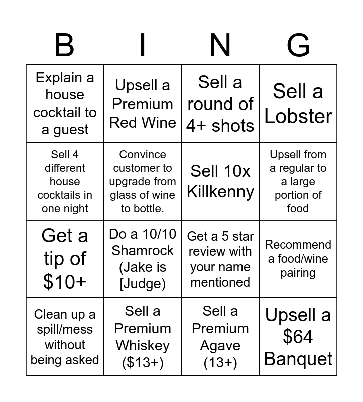 This bingo card has 16 words: Sell a Premium Whiskey ($13+), Recommend a food/wine pairing, Sell a round of 4+ shots, Explain a house cocktail to a guest, Get a tip of $10+, Upsell a Premium Red Wine, Get a 5 star review with your name mentioned, Sell a Premium Agave (13+), Sell 4 different house cocktails in one night, Convince customer to upgrade from glass of wine to bottle., Clean up a spill/mess without being asked, Sell a Lobster, Do a 10/10 Shamrock (Jake is [Judge), Upsell from a regular to a large portion of food, Sell 10x Killkenny and Upsell a $64 Banquet.