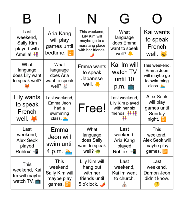 This bingo card has a free space and 35 words: What language does Alex want to speak well? ๐ถ, What language does Kai want to speak well? ๐ฑ, What language does Damon want to speak well? ๐ป, What language does Aria want to speak well? ๐ฐ, What language does Sally want to speak well? ๐ข, What language does Emma want to speak well? ๐ฅ, What language does Lily want to speak well? ๐ฆ, Alex wants to speak Japanese well. ๐ถ, Emma wants to speak Japanese well. ๐ฅ, Sally wants to speak Chinese well. ๐ข, Lily wants to speak French well. ๐ฆ, Kai wants to speak French well. ๐ฑ, Damon wants to speak Chinese, Japanese, and French well. ๐ป, Aria wants to speak all languages well. ๐ฐ, Last weekend, Sally Kim played with Amelia! ๐ญ, Last weekend, Lily Kim played with her six friends! ๐ญ๐ญ๐ญ, Last weekend, Kai Im went to church. โช, Last weekend, Emma Jeon had a swimming class. ๐, Last weekend, Alex Seok played Roblox! ๐ฒ, Last weekend, Damon Jeon didnโt know. ๐ค, Last weekend, Aria Kang played Roblox. ๐ฒ, This weekend, Kai Im will maybe watch TV. ๐บ, This weekend, Alex Seok will maybe play games. ๐ด, This weekend, Sally Kim will maybe play games. ๐ด, This weekend, Lily Kim will maybe go to a maratang place with her friends. ๐ถ๏ธ, This weekend, Emma Jeon will maybe go to swimming class. ๐, This weekend, Aria Kang will maybe play games. ๐ด, This weekend, Damon Jeon will maybe do nothing. ๐ฃ, Kai Im will watch TV until 10 p.m. ๐บ, Alex Seok will play games until Sunday night. ๐ด, Sally Kim will play games until dinner. ๐ด, Lily Kim will hang out with her friends until 5 oโclock. ๐ถ๏ธ, Emma Jeon will swim until 4 p.m. ๐, Aria Kang will play games until bedtime. ๐ด and Damon Jeon will rest until tomorrow. ๐ด.