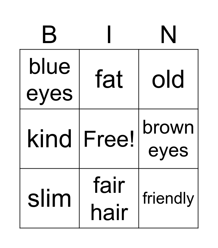 This bingo card has a free space and 13 words: tall, short, slim, fat, kind, friendly, funny, dark hair, fair hair, blue eyes, brown eyes, old and young.