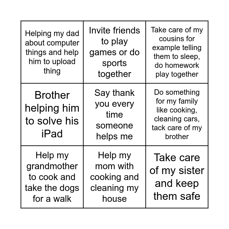 This bingo card has a free space and 8 words: Brother helping him to solve his iPad, Invite friends to play games or do sports together, Do something for my family like cooking, cleaning cars, tack care of my brother, Help my grandmother to cook and take the dogs for a walk, Take care of my cousins for example telling them to sleep, do homework play together, Helping my dad about computer things and help him to upload thing, Help my mom with cooking and cleaning my house and Take care of my sister and keep them safe.