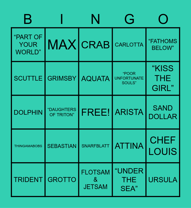 This bingo card has a free space and 46 words: ARIEL, URSULA, VANESSA, FLOTSAM & JETSAM, SEBASTIAN, PRINCE ERIC, MAX, FLOUNDER, SCUTTLE, KING TRITON, GRIMSBY, CARLOTTA, CHEF LOUIS, ATTINA, ALANA, ADELLA, AQUATA, ARISTA, ANDRINA, “FATHOMS BELOW”, “DAUGHTERS OF TRITON”, “UNDER THE SEA”, “PART OF YOUR WORLD”, “POOR UNFORTUNATE SOULS”, “LES POISSONS”, “KISS THE GIRL”, TRIDENT, DINGLEHOPPER, SNARFBLATT, THINGAMABOBS, URSULA’S CAULDRON, URSULA’S NECKLACE, ROYAL SHIP, PRINCE ERIC STATUE, ATLANTICA, GROTTO, SAND DOLLAR, SEASHELL, SEAWEED, SEAHORSE, JELLYFISH, CRAB, DOLPHIN, WHALE, SEA SNAIL and CORAL.