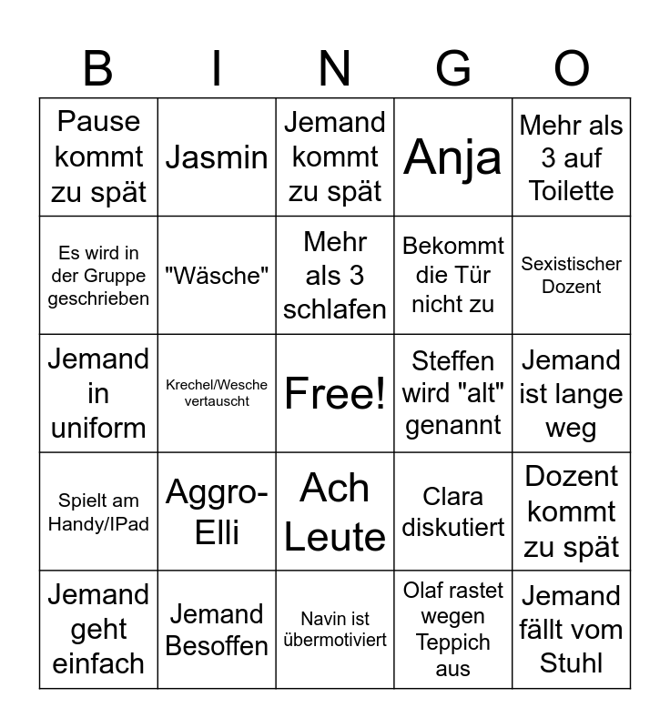 This bingo card has a free space and 24 words: Aggro-Elli, Jemand Besoffen, Mehr als 3 schlafen, Jemand geht einfach, Mehr als 3 auf Toilette, Pause kommt zu spät, Es wird in der Gruppe geschrieben, Jasmin, Steffen wird "alt" genannt, Ach Leute, Bekommt die Tür nicht zu, Jemand in uniform, Clara diskutiert, Dozent kommt zu spät, "Wäsche", Olaf rastet wegen Teppich aus, Jemand ist lange weg, Jemand kommt zu spät, Sexistischer Dozent, Krechel/Wesche vertauscht, Jemand fällt vom Stuhl, Spielt am Handy/IPad, Anja and Navin ist übermotiviert.