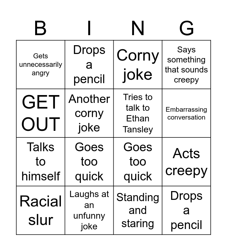 This bingo card has 19 words: Goes too quick, Talks to his computer, Corny joke, Drops a pencil, Acts creepy, GET OUT, Standing and staring, Gets unnecessarily angry, Drops a pencil, Talks to himself, Goes too quick, Another corny joke, Tries to talk to Ethan Tansley, Laughs at an unfunny joke, Racial slur, Seductively leaning, Says something that sounds creepy, Embarrassing conversation and Talks to his computer.