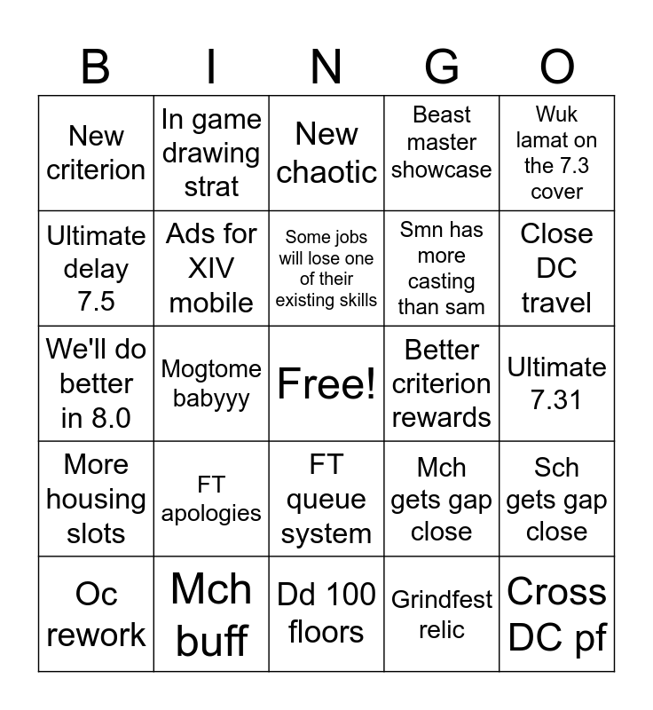 This bingo card has a free space and 24 words: FT apologies, Mch buff, Some jobs will lose one of their existing skills, Oc rework, Wuk lamat on the 7.3 cover, New criterion, Ultimate delay 7.5, In game drawing strat, Better criterion rewards, FT queue system, Smn has more casting than sam, We'll do better in 8.0, Mch gets gap close, Sch gets gap close, Ads for XIV mobile, Grindfest relic, Ultimate 7.31, New chaotic, Close DC travel, Mogtome babyyy, Cross DC pf, More housing slots, Beast master showcase and Dd 100 floors.