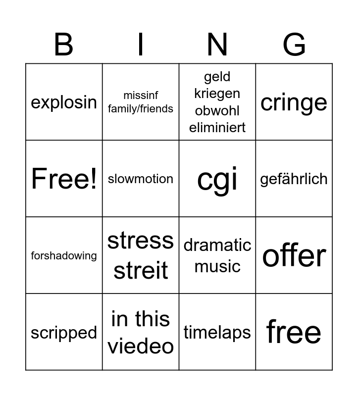 This bingo card has 16 words: in this viedeo, offer, geld kriegen obwohl eliminiert, explosin, forshadowing, missinf family/friends, dramatic music, timelaps, Free!, slowmotion, scripped, cringe, stress streit, gefährlich, cgi and free.