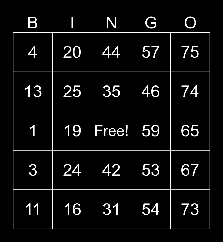 This bingo card has a free space and 24 words: 11, 24, 35, 54, 75, 4, 20, 44, 59, 65, 1, 25, 53, 67, 13, 16, 31, 57, 74, 3, 19, 42, 46 and 73.