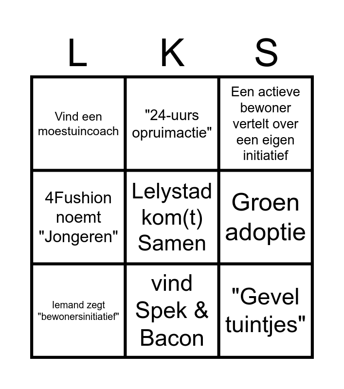 This bingo card has a free space and 17 words: Lelystad Schoon noemt Zwerfafval, Iemand zegt "Verbinden", Een actieve bewoner vertelt over een eigen initiatief, Vind een moestuincoach, Wissel (min) 1 visite kaartje uit, 4Fushion noemt "Jongeren", "Hanging Baskets", Iemand zegt "bewonersinitiatief", vind Spek & Bacon, Groen adoptie, "Mensen maken de Buurt", "Leefbaarheid", "Gevel tuintjes", "24-uurs opruimactie", Vuil knijpers, Iemand zegt "Bewoners initiatief" and Iemand benoemd het Woldpark.