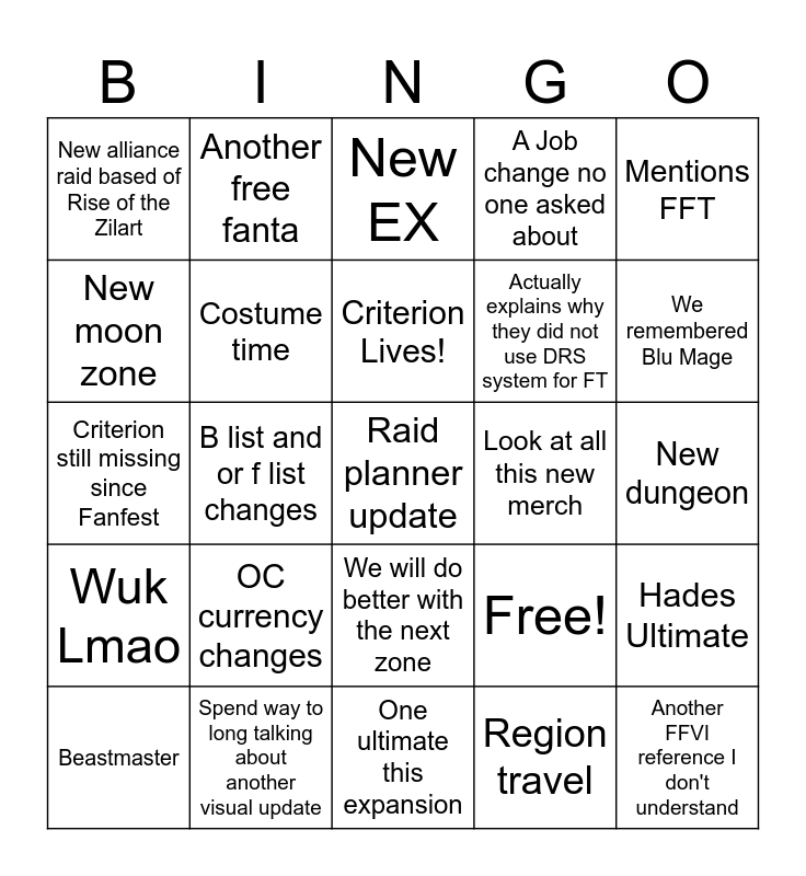 This bingo card has 25 words: OC currency changes, One ultimate this expansion, Criterion Lives!, Beastmaster, Mentions FFT, New alliance raid based of Rise of the Zilart, New moon zone, Another free fanta, Look at all this new merch, We will do better with the next zone, Actually explains why they did not use DRS system for FT, Criterion still missing since Fanfest, Free!, Hades Ultimate, Costume time, Another FFVI reference I don't understand, New dungeon, New EX, We remembered Blu Mage, B list and or f list changes, Raid planner update, Spend way to long talking about another visual update, Wuk Lmao, A Job change no one asked about and Region travel.