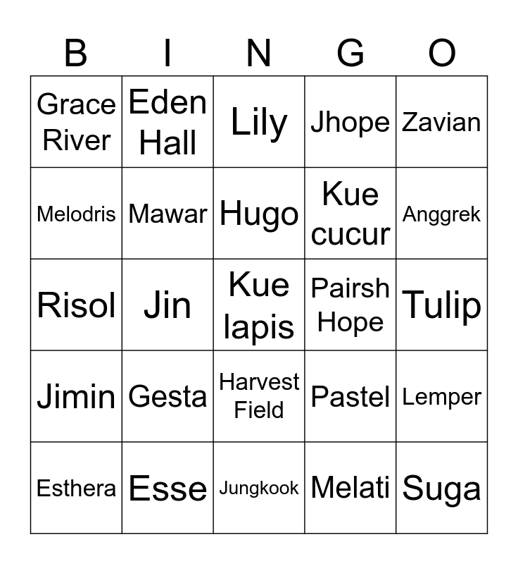 This bingo card has a free space and 24 words: Gesta, Esse, Hugo, Esthera, Zavian, Grace River, Melodris, Eden Hall, Pairsh Hope, Harvest Field, Kue cucur, Risol, Pastel, Lemper, Mawar, Melati, Tulip, Lily, Anggrek, Jin, Suga, Jimin, Jhope and Jungkook.