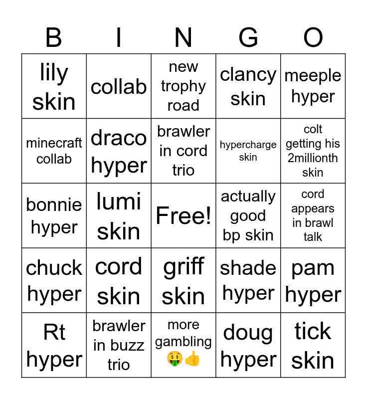 This bingo card has a free space and 24 words: cord skin, brawler in buzz trio, brawler in cord trio, Rt hyper, meeple hyper, lily skin, minecraft collab, collab, actually good bp skin, griff skin, hypercharge skin, bonnie hyper, shade hyper, pam hyper, draco hyper, doug hyper, cord appears in brawl talk, new trophy road, colt getting his 2millionth skin, lumi skin, tick skin, chuck hyper, clancy skin and more gambling 🤑👍.