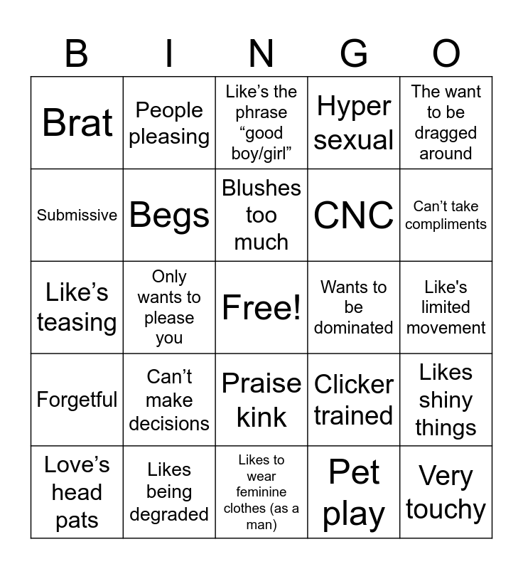 This bingo card has a free space and 24 words: Love’s head pats, Can’t make decisions, Blushes too much, Pet play, The want to be dragged around, Brat, People pleasing, Like’s the phrase “good boy/girl”, Wants to be dominated, Like's limited movement, Like’s teasing, Begs, Clicker trained, Likes shiny things, Submissive, Likes being degraded, Likes to wear feminine clothes (as a man), Hyper sexual, Can’t take compliments, Forgetful, Only wants to please you, Praise kink, CNC and Very touchy.