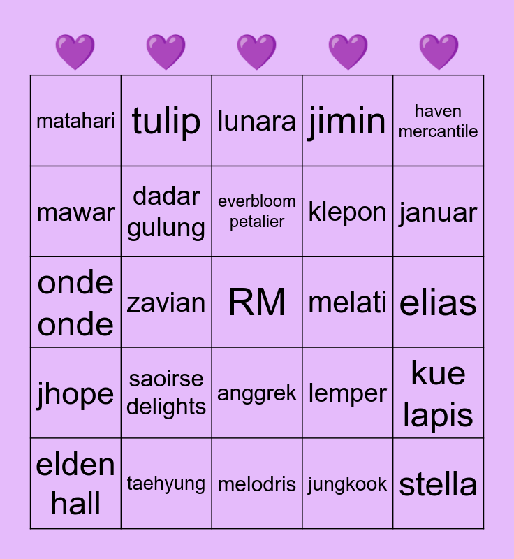 This bingo card has 25 words: saoirse delights, melodris, everbloom petalier, elden hall, haven mercantile, matahari, mawar, tulip, melati, anggrek, klepon, onde onde, lemper, kue lapis, dadar gulung, stella, elias, lunara, januar, zavian, RM, taehyung, jhope, jimin and jungkook.