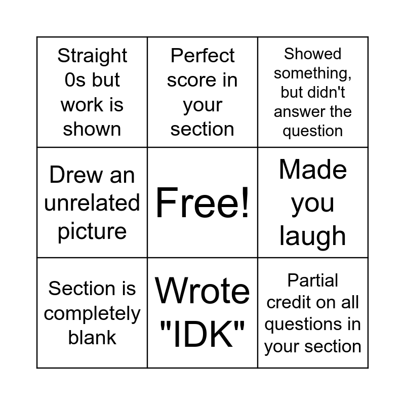 This bingo card has a free space and 8 words: Made you laugh, Showed something, but didn't answer the question, Perfect score in your section, Section is completely blank, Straight 0s but work is shown, Partial credit on all questions in your section, Drew an unrelated picture and Wrote "IDK".