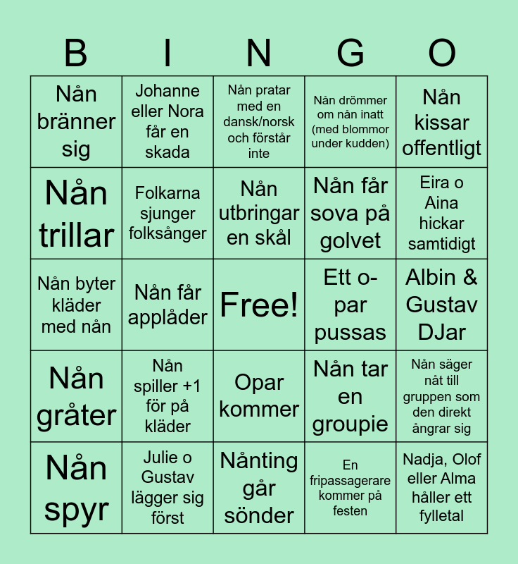 This bingo card has a free space and 24 words: NÄn spiller +1 för pÄ klÀder, Julie o Gustav lÀgger sig först, NÄn utbringar en skÄl, NÄn spyr, NÄn kissar offentligt, NÄn brÀnner sig, NÄn trillar, Johanne eller Nora fÄr en skada, Ett o-par pussas, Opar kommer, NÄn fÄr sova pÄ golvet, NÄn byter klÀder med nÄn, NÄn tar en groupie, NÄn sÀger nÄt till gruppen som den direkt Ängrar sig, Folkarna sjunger folksÄnger, En fripassagerare kommer pÄ festen, Albin & Gustav DJar, NÄn pratar med en dansk/norsk och förstÄr inte, Eira o Aina hickar samtidigt, NÄn fÄr applÄder, Nadja, Olof eller Alma hÄller ett fylletal, NÄn grÄter, NÄn drömmer om nÄn inatt (med blommor under kudden) and NÄnting gÄr sönder.