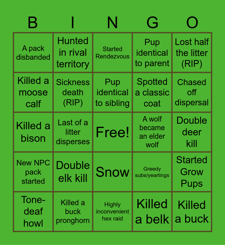 This bingo card has a free space and 59 words: Pup disperses, Killed a buck pronghorn, Got a new mate, New NPC pack started, Killed a belk, Killed a moose, Sickness death (RIP), Started Raise Pups, Spotted a classic coat, A NPC relative died, Pup identical to parent, New player pack started, Killed a moose calf, Pup looks nothing like parents, Started Young Hunters, A pack disbanded, Killed a buck, Lost half the litter (RIP), A pup got lost, Pup identical to sibling, A wolf became an elder wolf, Started Rendezvous, Tone-deaf howl, Started Grow Pups, Classic howl, Favorite coat, Sub reaches age 5, Lost wolf fight, Chased off dispersal, Killed rival wolf, Reckless pup, Unknown fate (RIP), Ran into adult child, Found bison carcass, Hunted in rival territory, A pack leader dies, Siblings disperse together, Last of a litter disperses, Litter of all the same gender, Killed a bison, Pack rally, Double elk kill, Double deer kill, Triple deer kill, Got mufasa'd, Dispersal thinks they won (they didn't), Accidentally bouncy, Rain/Storm, Snow, Highly inconvenient hex raid, Saved pup from death, Stole rival hex, Territory jumpscare, Pups are starving, Major injury, Greedy subs/yearlings, So many coyotes, Really? This is all your backup? and Attack from same pack back to back.