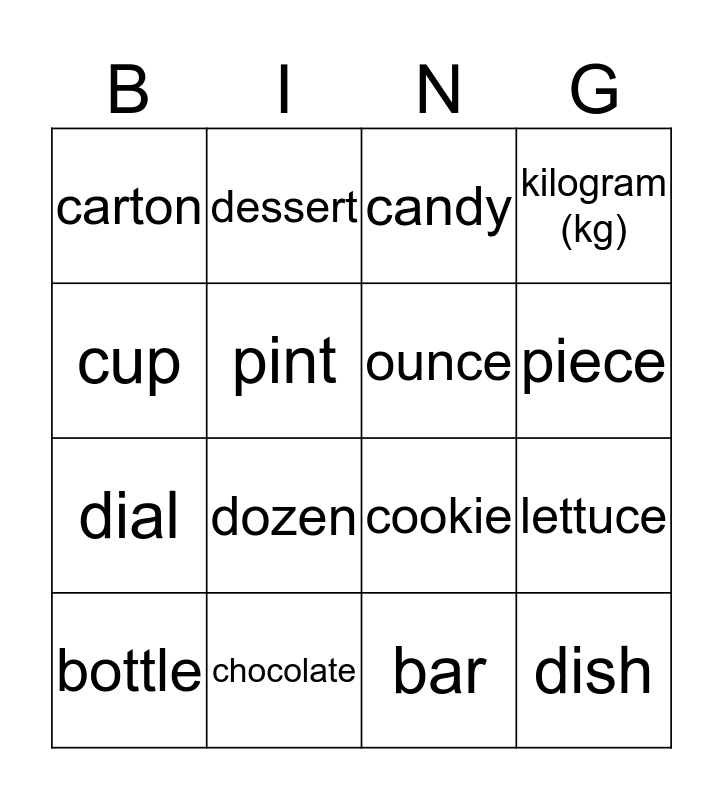 This bingo card has 17 words: bar, bottle, candy, carton, dozen, kilogram (kg), lettuce, ounce, piece, pint, chocolate, cookie, cup, dessert, dial, dial tone and dish.