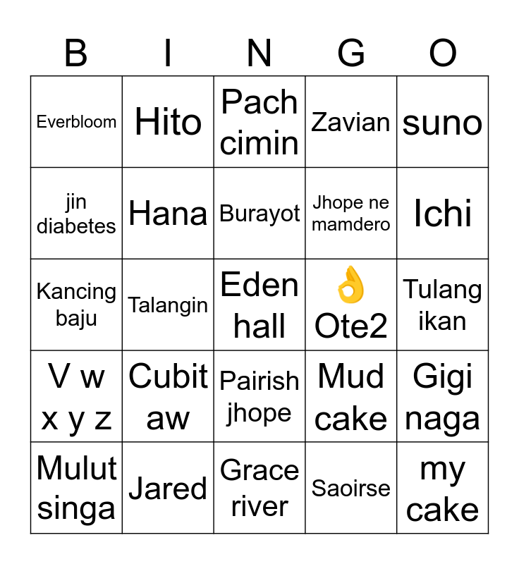 This bingo card has a free space and 24 words: Cubit aw, Jared, Burayot, Mulut singa, suno, Everbloom, jin diabetes, Hito, 👌Ote2, Pairish jhope, Jhope ne mamdero, Kancing baju, Mud cake, Gigi naga, Hana, Saoirse, Tulang ikan, Pach cimin, Ichi, Talangin, my cake, V w x y z, Zavian and Grace river.