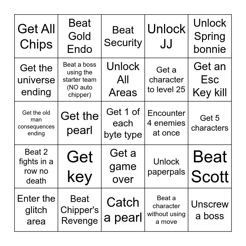 This bingo card has 25 words: Get key, Catch a pearl, Unlock All Areas, Enter the glitch area, Unlock Spring bonnie, Get All Chips, Get the universe ending, Beat Gold Endo, Encounter 4 enemies at once, Get a game over, Get a character to level 25, Get the old man consequences ending, Unlock paperpals, Beat Scott, Beat a boss using the starter team (NO auto chipper), Unscrew a boss, Get 5 characters, Beat Security, Get an Esc Key kill, Get the pearl, Get 1 of each byte type, Beat Chipper's Revenge, Beat 2 fights in a row no death, Unlock JJ and Beat a character without using a move.