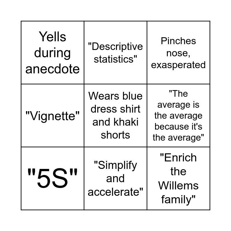 This bingo card has a free space and 12 words: "Go to the Gemba", "You're like, Sean...", "Enrich the Willems family", "The average is the average because it's the average", "Descriptive statistics", Pinches nose, exasperated, "Simplify and accelerate", Looks at both watches, Yells during anecdote, "Vignette", "5S" and "Awesome".